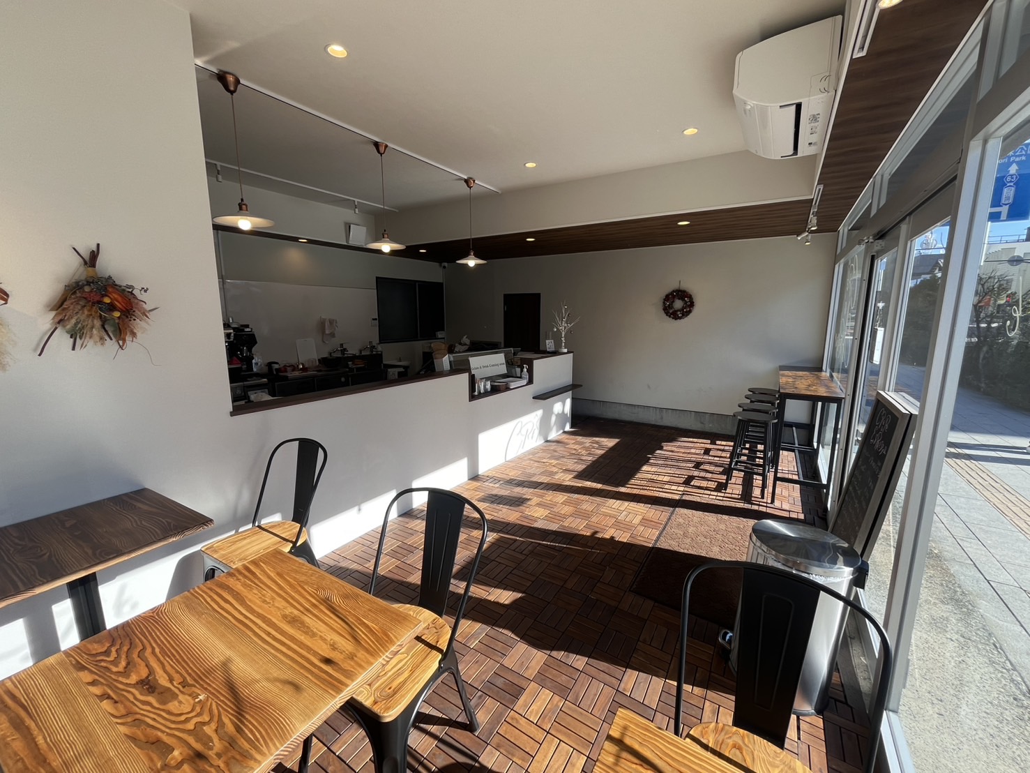 内装は、地域の空気感に寄り添うよう木の質感やナチュラルな素材を活かした温もりのある空間設計に。クレープとエスプレッソを片手に、ゆったりとした時間をお楽しみいただけます。