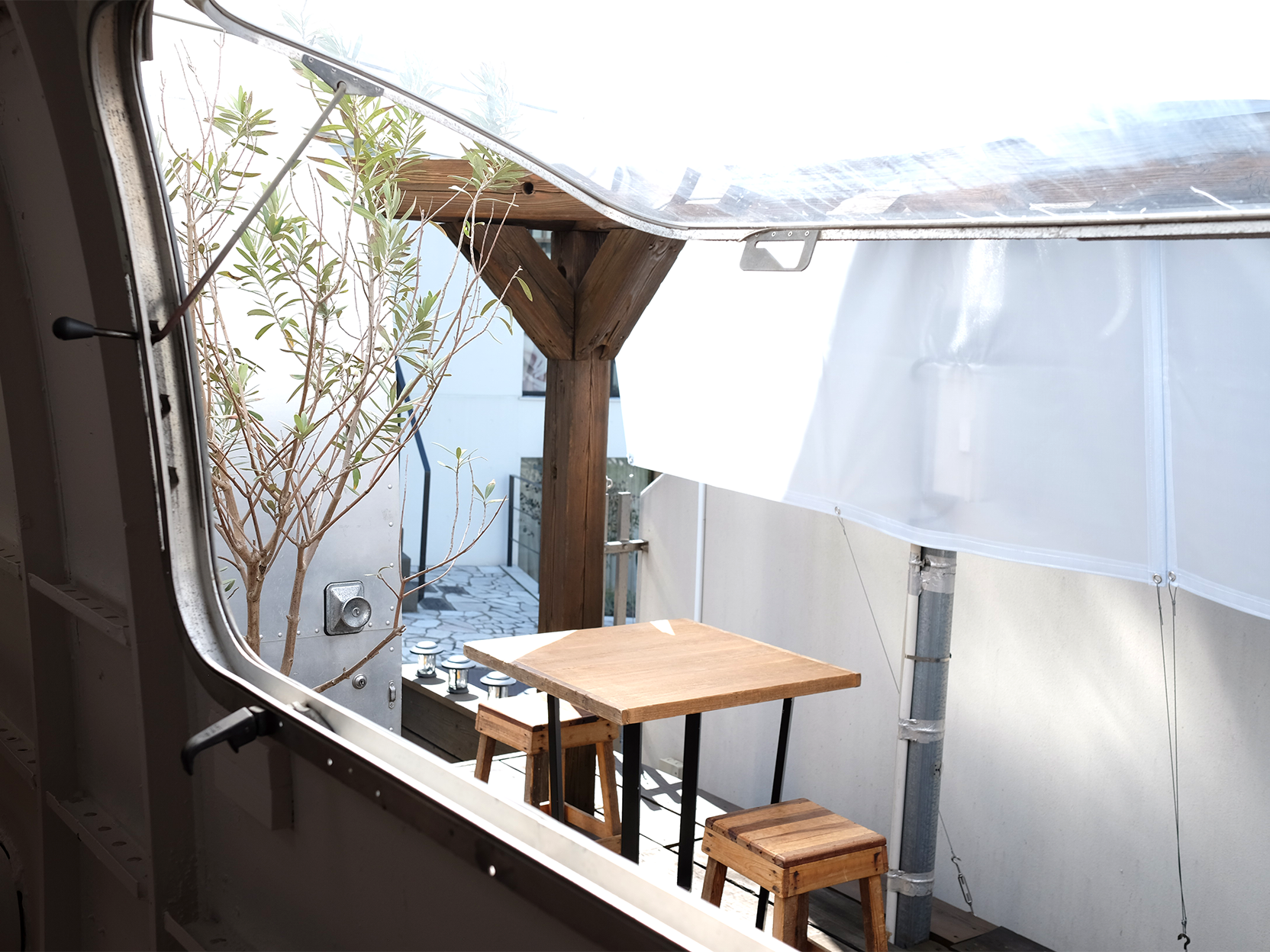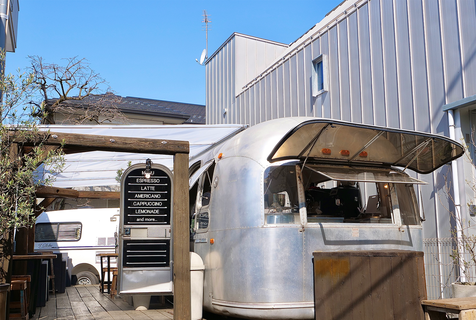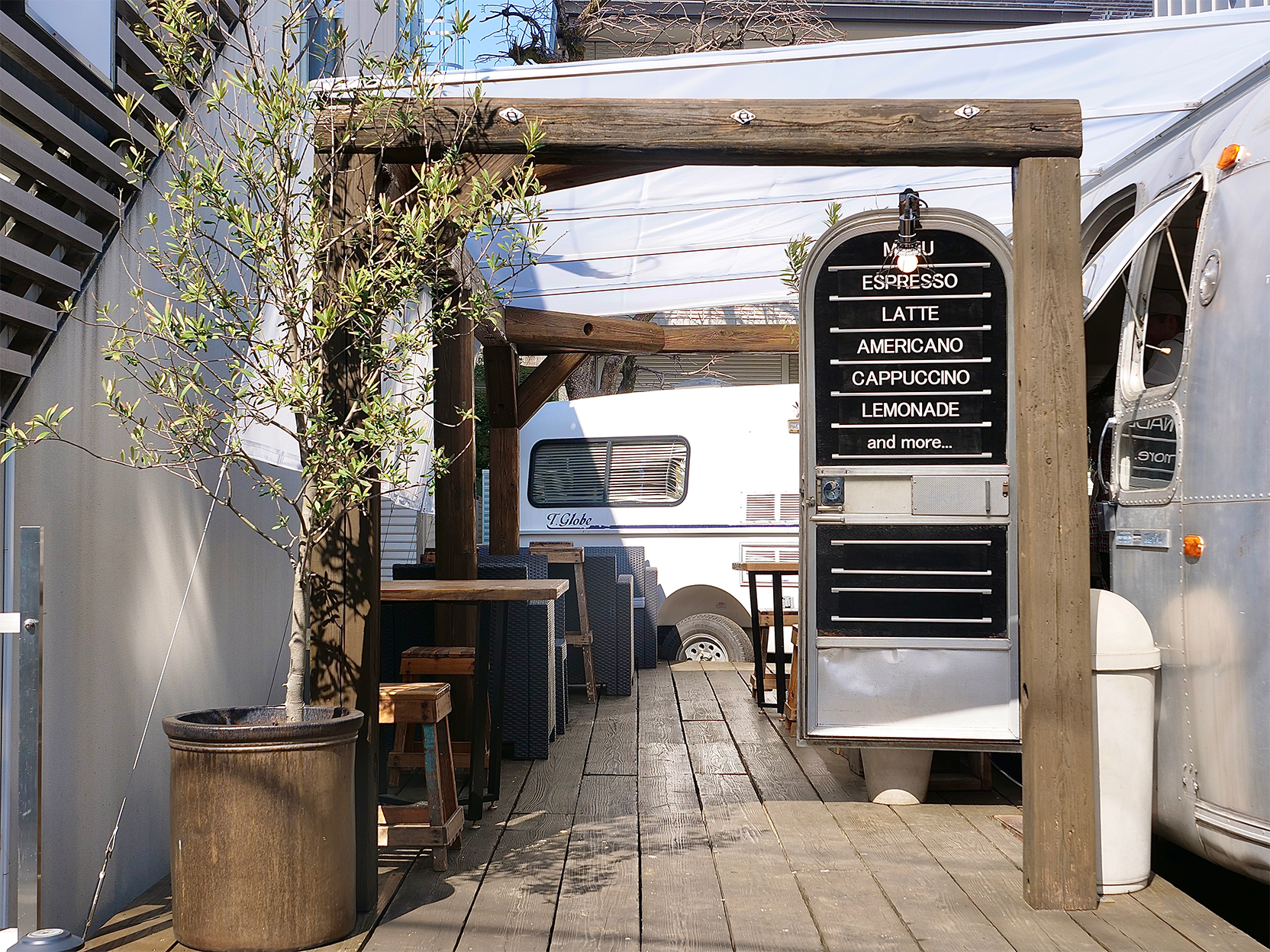 都心の路地裏に佇む、木の温もりとスタイリッシュなエアストリームが特徴的な店舗です。